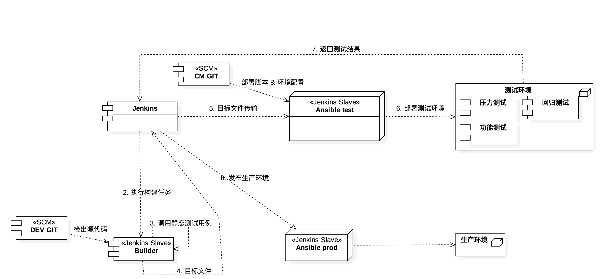 - 物理节点分为Jenkins、SCM、Builder、Ansible Test、Ansible Prod。其中Ansible Test与测试环境在测试网域,Ansible Prod在生产网域。 Jenkins通过VPN或合适的方式,实现与SCM、Ansible的连接。